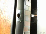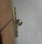 丁番側のドアから出っ張った突起部分をドア枠の穴に埋め込んで固定します。 -